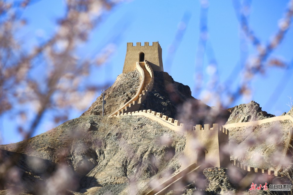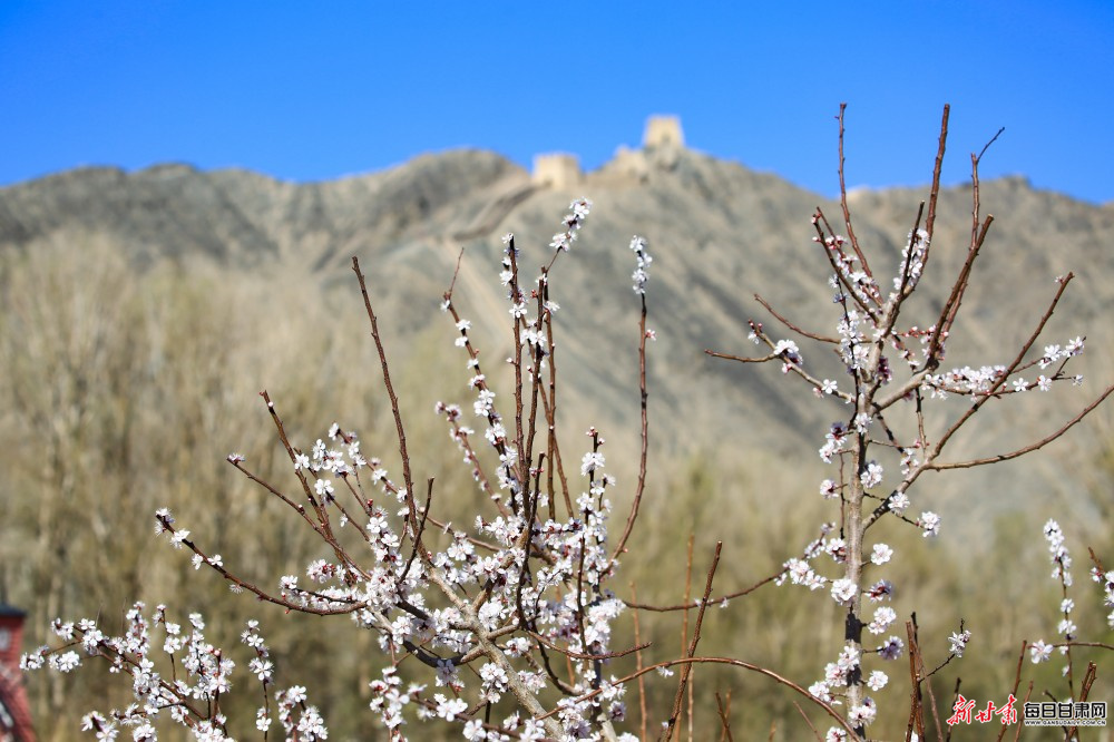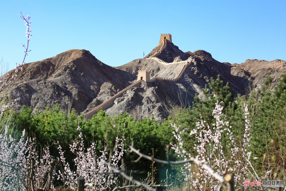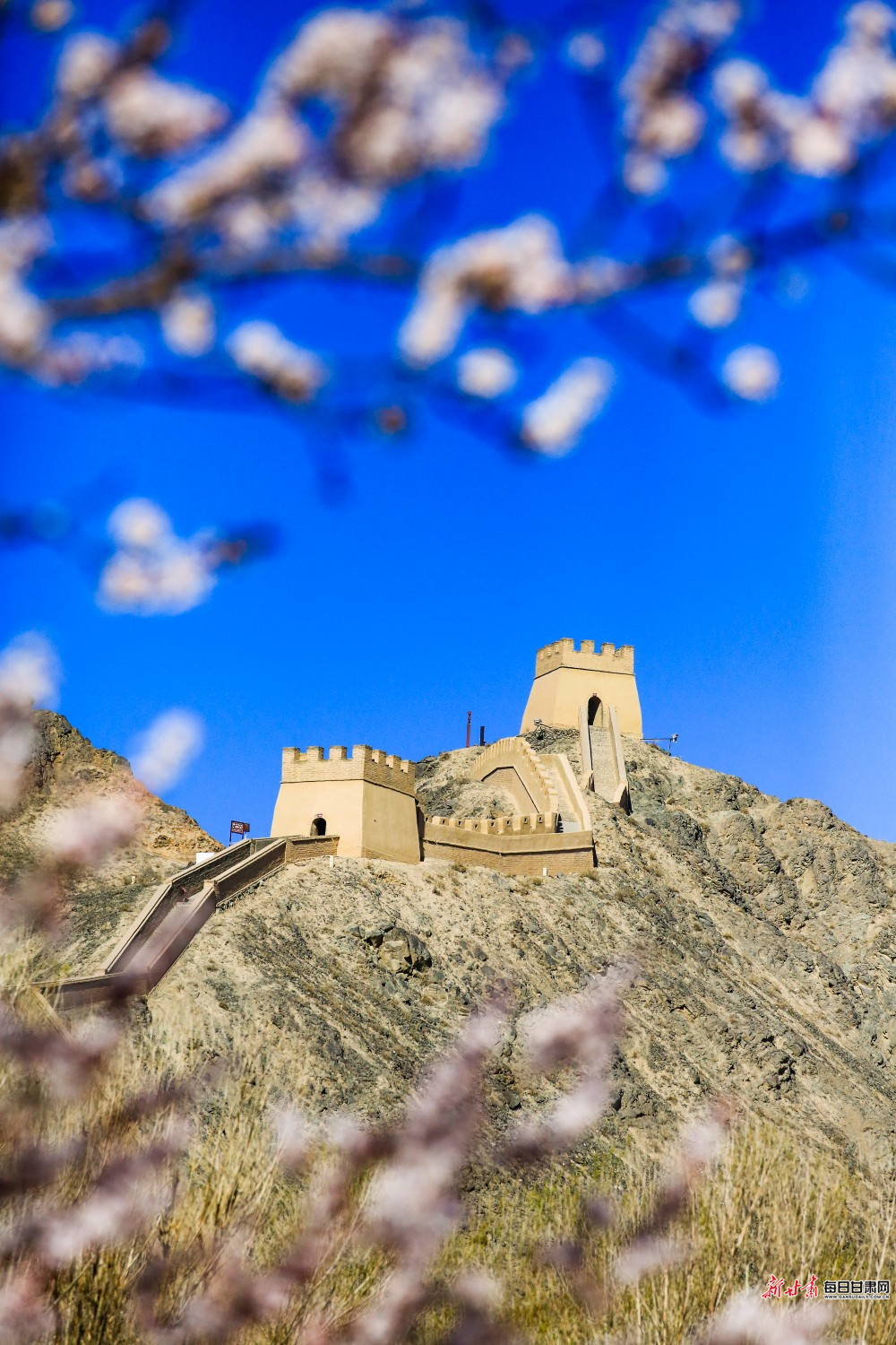 春风拂过关隘,山间杏花次第盛开,粉白相间的花朵缀满枝头,如云似霞、暗香浮动。雄浑古朴的城墙蜿蜒起伏,在烂漫花海的映衬下更显雄奇壮阔,戈壁雄关与柔媚春色碰撞交融,尽显独特的西北春日风情。
